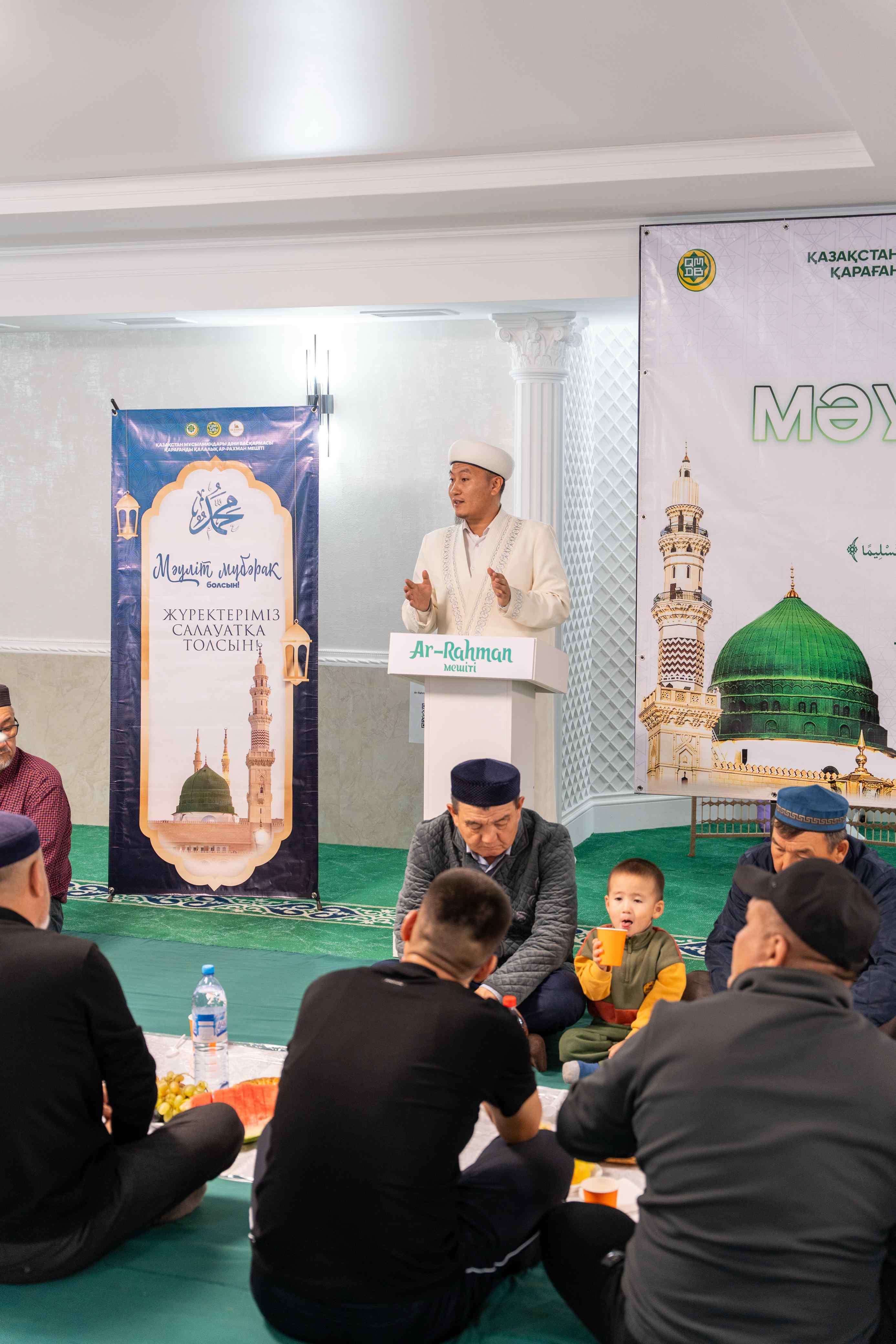 Іс-шараны мешіттің бас имамы Азамат Төлеуханұлы ашып, Мәуліттің тағылымдық мәні мен салауат айтудың артықшылықтары жайында насихат жүргізді.