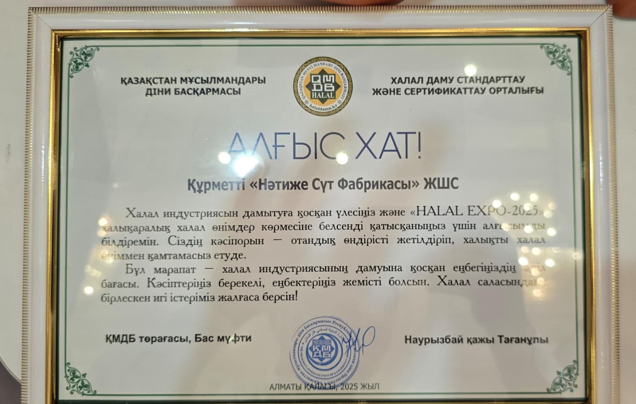 Қазақстан мұсылмандары діни басқармасының төрағасы, Бас мүфти Наурызбай қажы Тағанұлының бастамасымен Алматыда өткен «HALAL EXPO-2025» халықаралық көрмесінде «Нәтиже Сүт Фабрикасы» ЖШС үздік халал кәсіпорындар қатарында марапаттады.