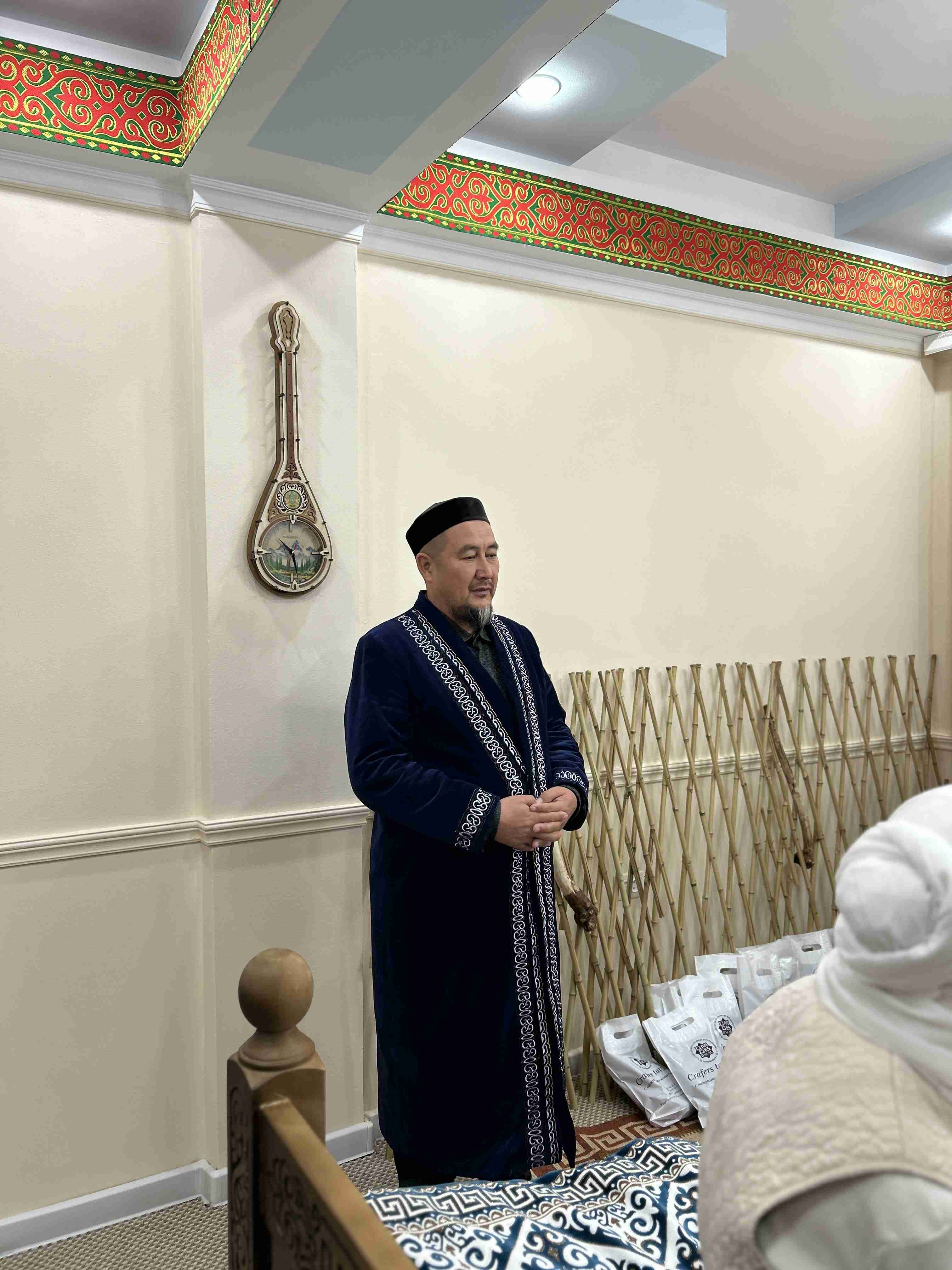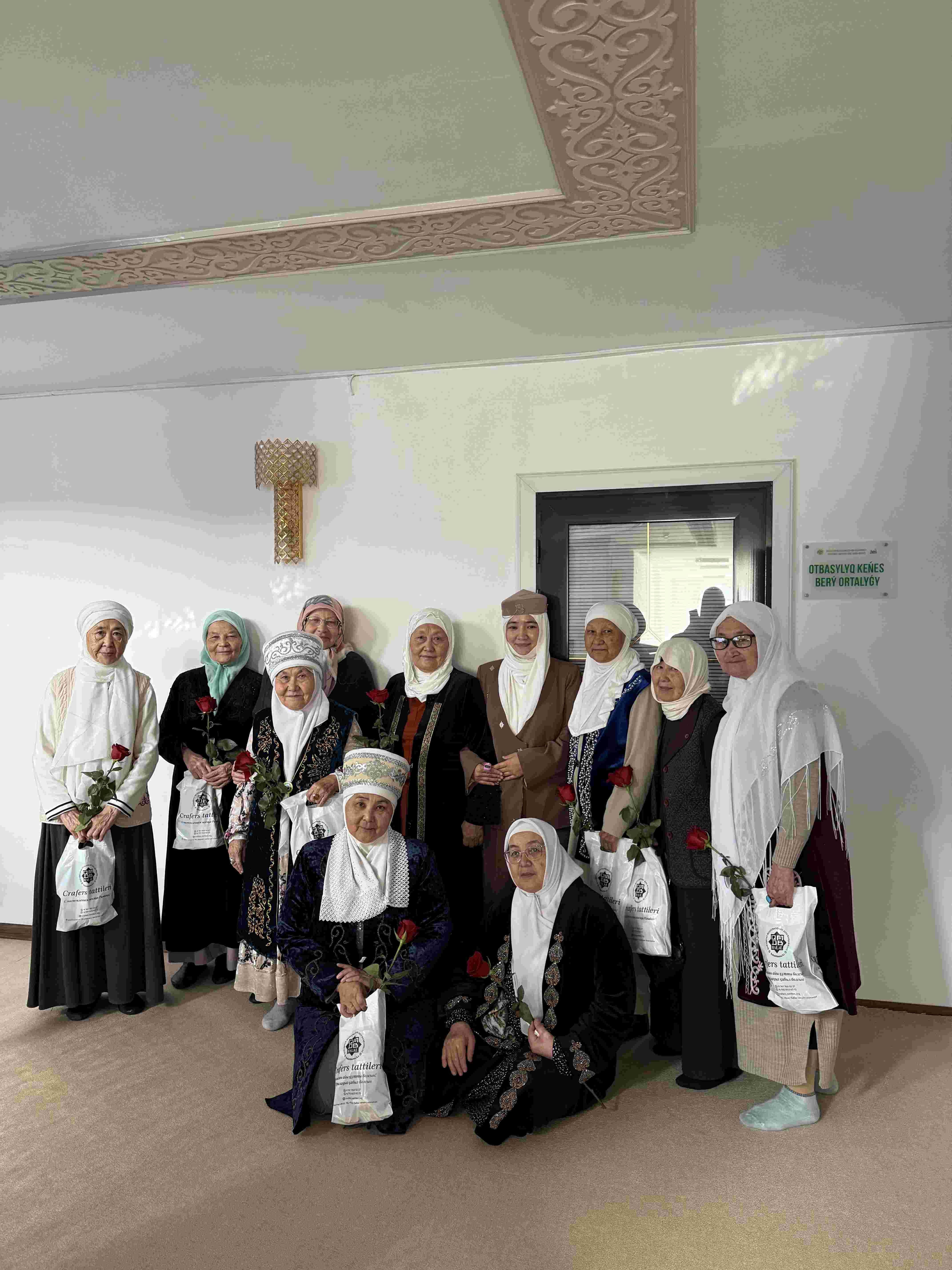 Мешіт ұстазы Әйгерім Берікболқызы әжелер қауымына жылы лебізін білдіріп, тағылымды насихатын айтып, сыйлықтар мен қызыл раушан гүлдерін тарту етті.