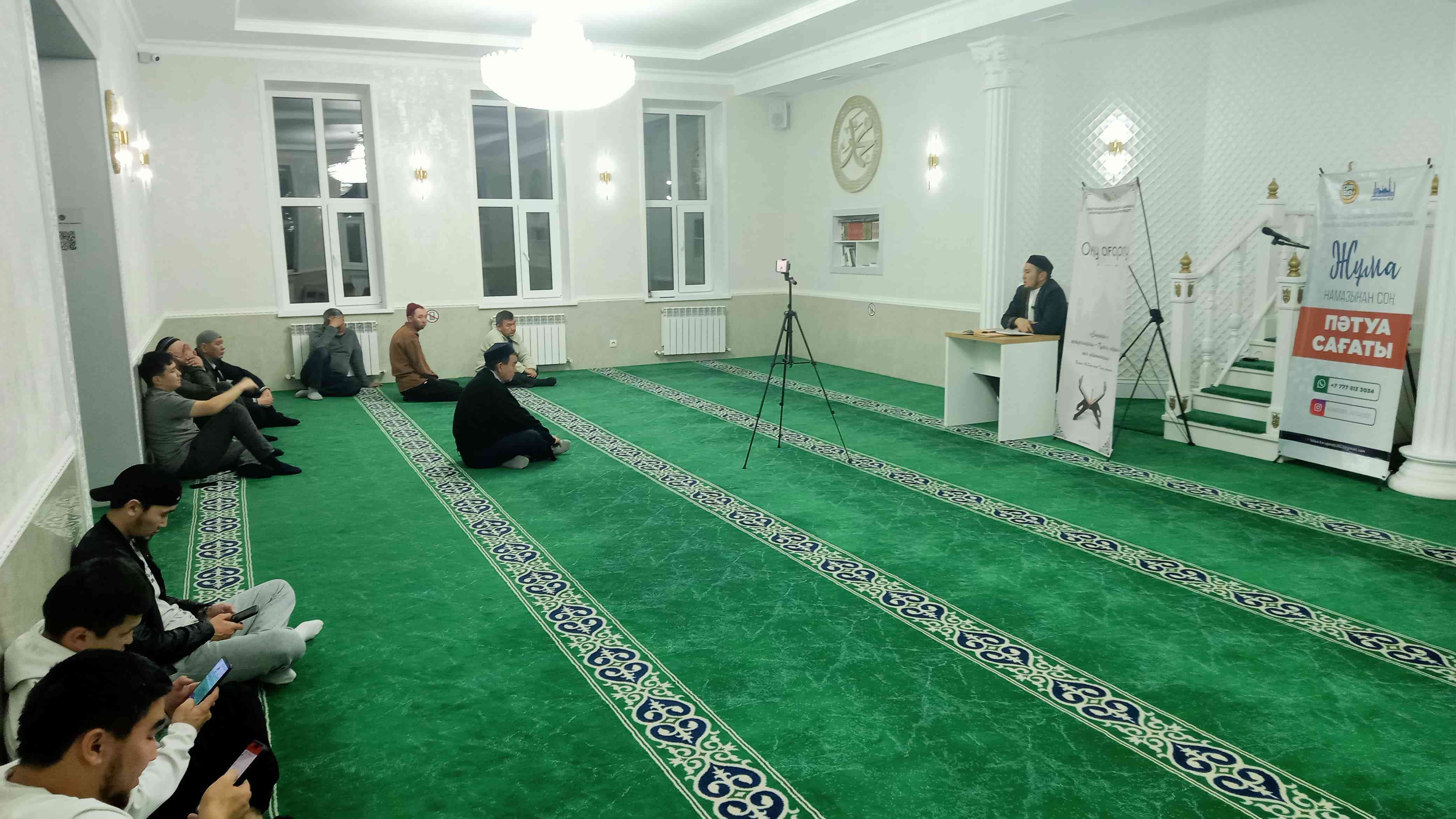 Дәрісті Жолдыбаев Заңғар ұстаз өткізіп, Пайғамбарымыз Мұхаммед ﷺ-нің хадистерінде қамтылған рухани және ахлақтық құндылықтар, тақуалық, көркем мінез, қоғаммен қарым-қатынас әдебі, сондай-ақ құлшылыққа қатысты мәселелерін жан-жақты түсіндіруде.
