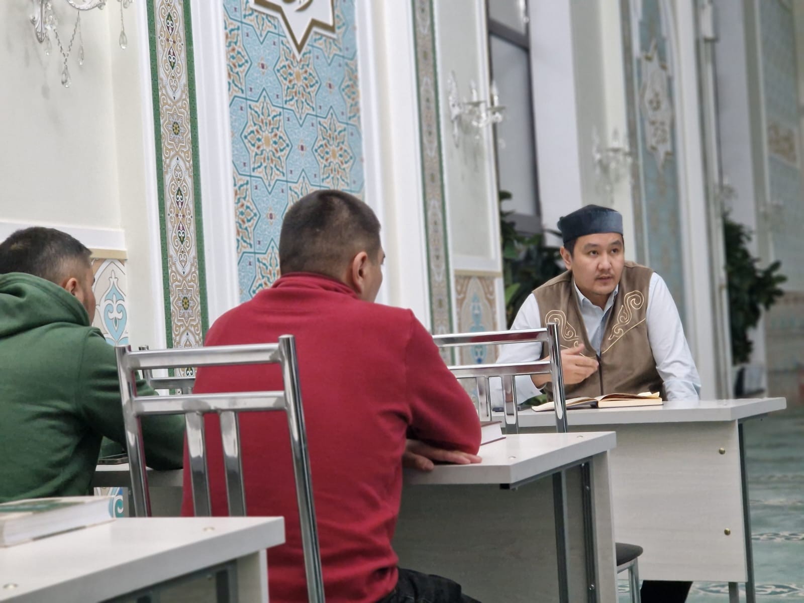 Дәрісті мешіттің наиб имамы Дархан Түменбай жүргізіп, қатысушыларға сенім негіздері, ғибадаттың маңызы және мұсылман әдебі жайында жан-жақты мағлұмат беруде.