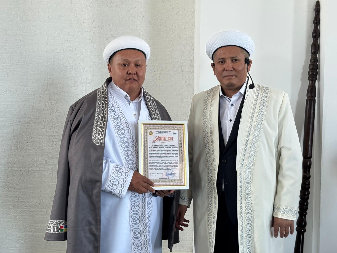 Сондай-ақ, Приозерск қалалық мешітінде бұған дейін имамдық қызметін абыройлы атқарып, дін жолында белсенді қызмет атқарған Қожахметов Давид Сейтқалиұлына жасаған жұмыстары үшін ҚМДБ-ның Қарағанды облысы бойынша бас имамы Естай қажы Айтуғанұлының арнайы алғыс хатын табыстап, қазақы құрметпен иығына шапан жапты.