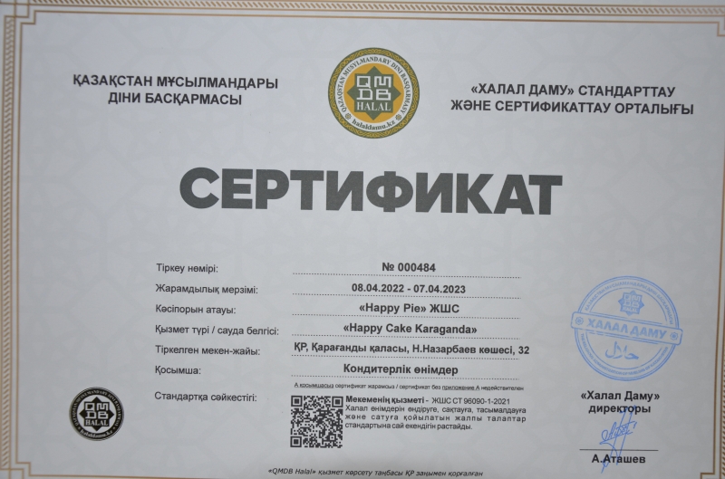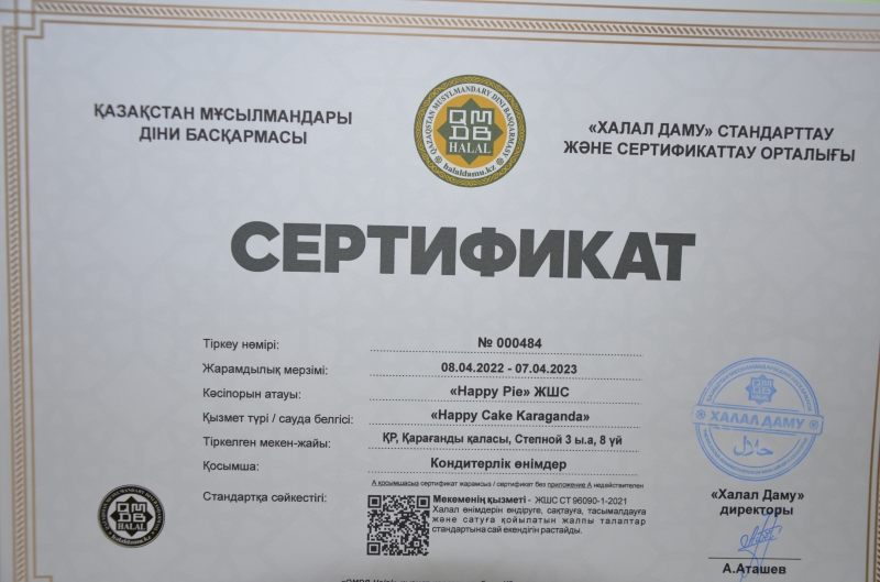 Қарағанды қаласында орналасқан кондитерлік өнімдер өндіруші «Happy Piе» ЖШС «Happy Cake» кәсіпорыны «ҚМДБ халал» стандарты бойынша сертификатын жаңартты. Кондитерлік өнімдер «Happy Cake» сауда белгісімен шығарылады. «Халал Даму» ЖШС-ның Қарағанды облысы бойынша жауапты өкілі Ысқақ Абдархманов кәсіпорнының өндіріс аймағында болып, бақылау-қадағалау шараларын орындады. Өндіріс аймағы санитарлық тазалық талаптарына толықтай сай, «ҚМДБ халал» стандартын бұзу жағдайлары анықталмады. «Happy Cake» кәсіпорны «Тамақтандыру қызметтері», «Халал өнімдерді өндіру, өңдеу, дайындау, сақтау, тасымалдау және сатуға қойылатын жалпы талаптар» стандартына сай деп танылып, «ҚМДБ халал» сертификаты табысталды.