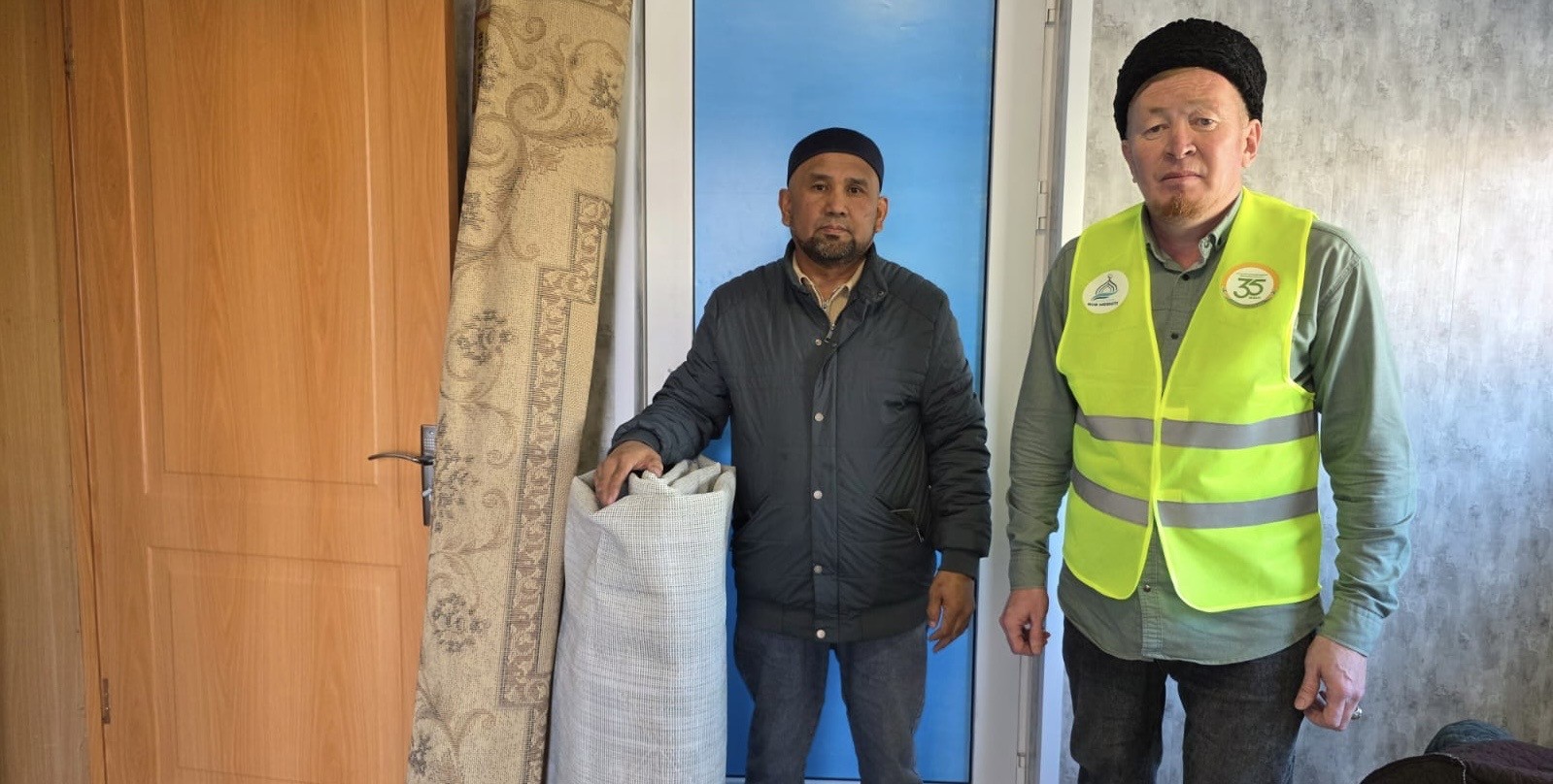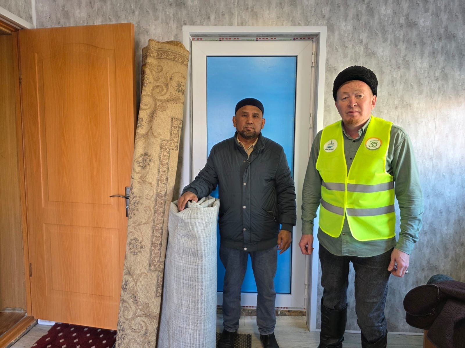 Зекет және қайырымдылық бағытының жауапты маманы Нұрғали Байкешев мешіт атынан аталған кілемдерді қор басшысы Рүстем Нілдібекұлына табыстады.
