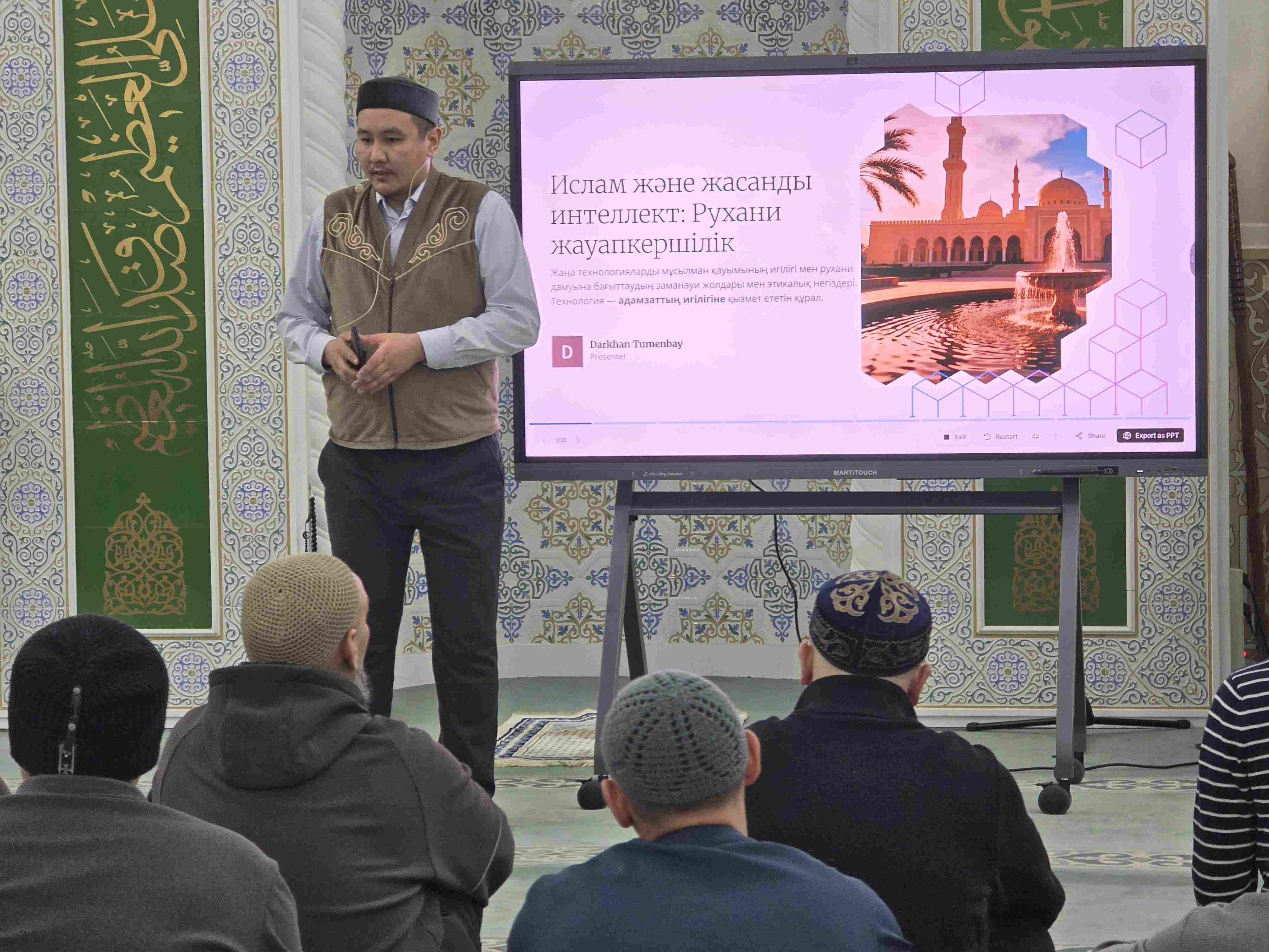 Кездесу барысында мешіттің наиб имамы Дархан Түменбай жасанды интеллекттің мүмкіндіктері мен қауіптері, оны дұрыс әрі пайдалы бағытта қолданудың маңыздылығы жайында кеңінен тоқталды. Сондай-ақ, жастарды білімге ұмтылып, заманауи технологияларды имани тәрбие мен рухани құндылықтарға сай пайдалану қажеттігін атап өтті.