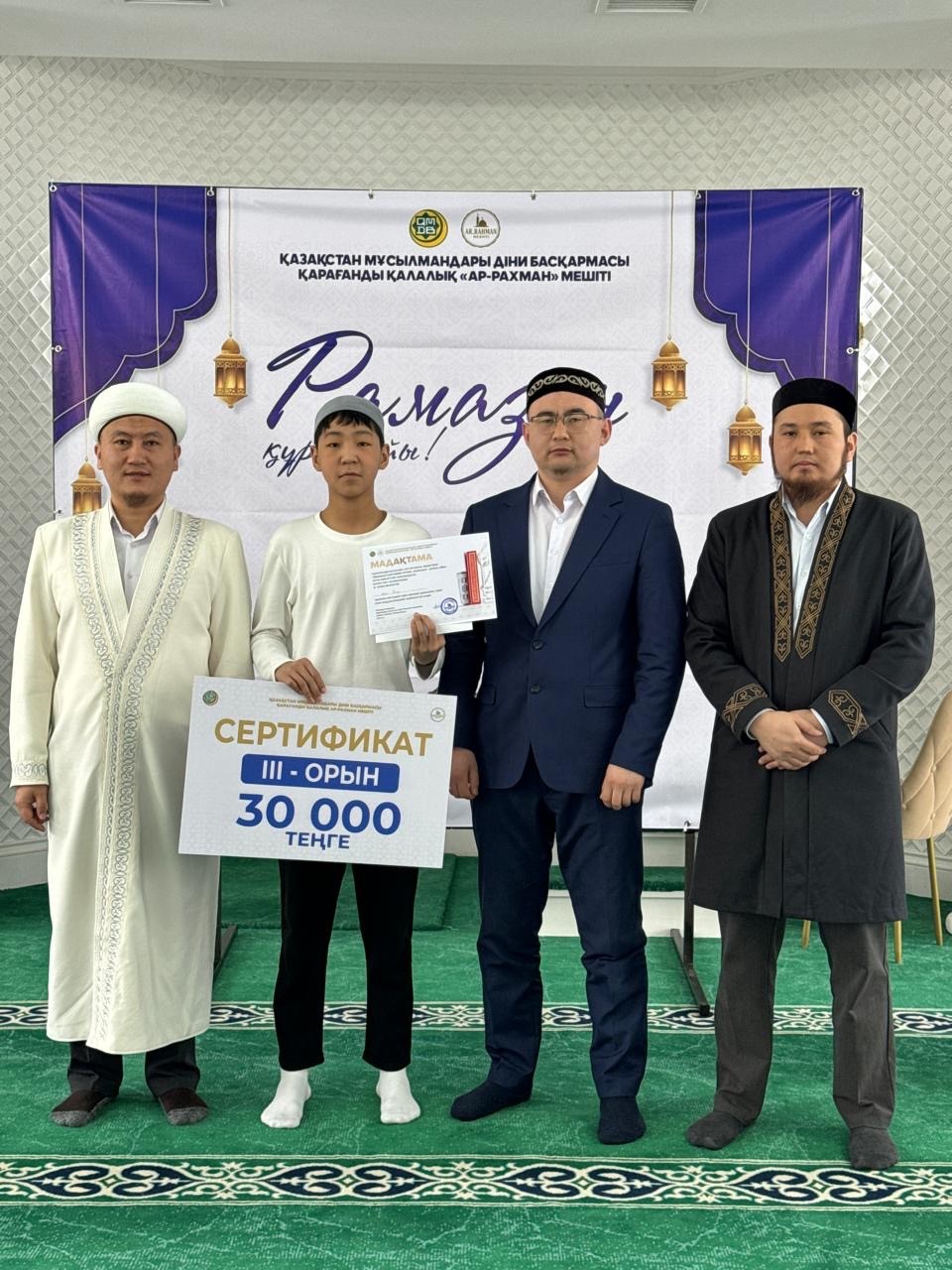III орын – «Қазыбек би» мешітінің шәкірті (30 000 теңге) жүлде қорын иеленді.