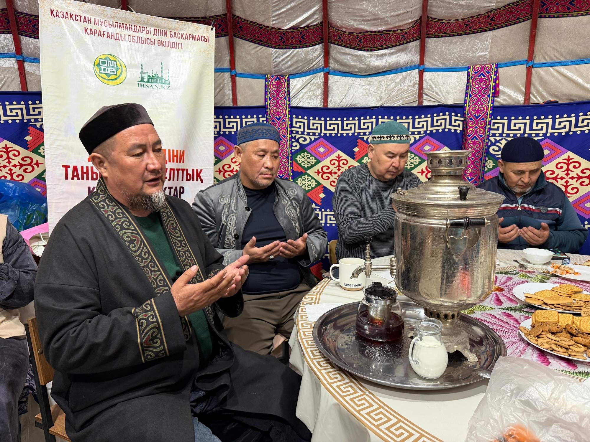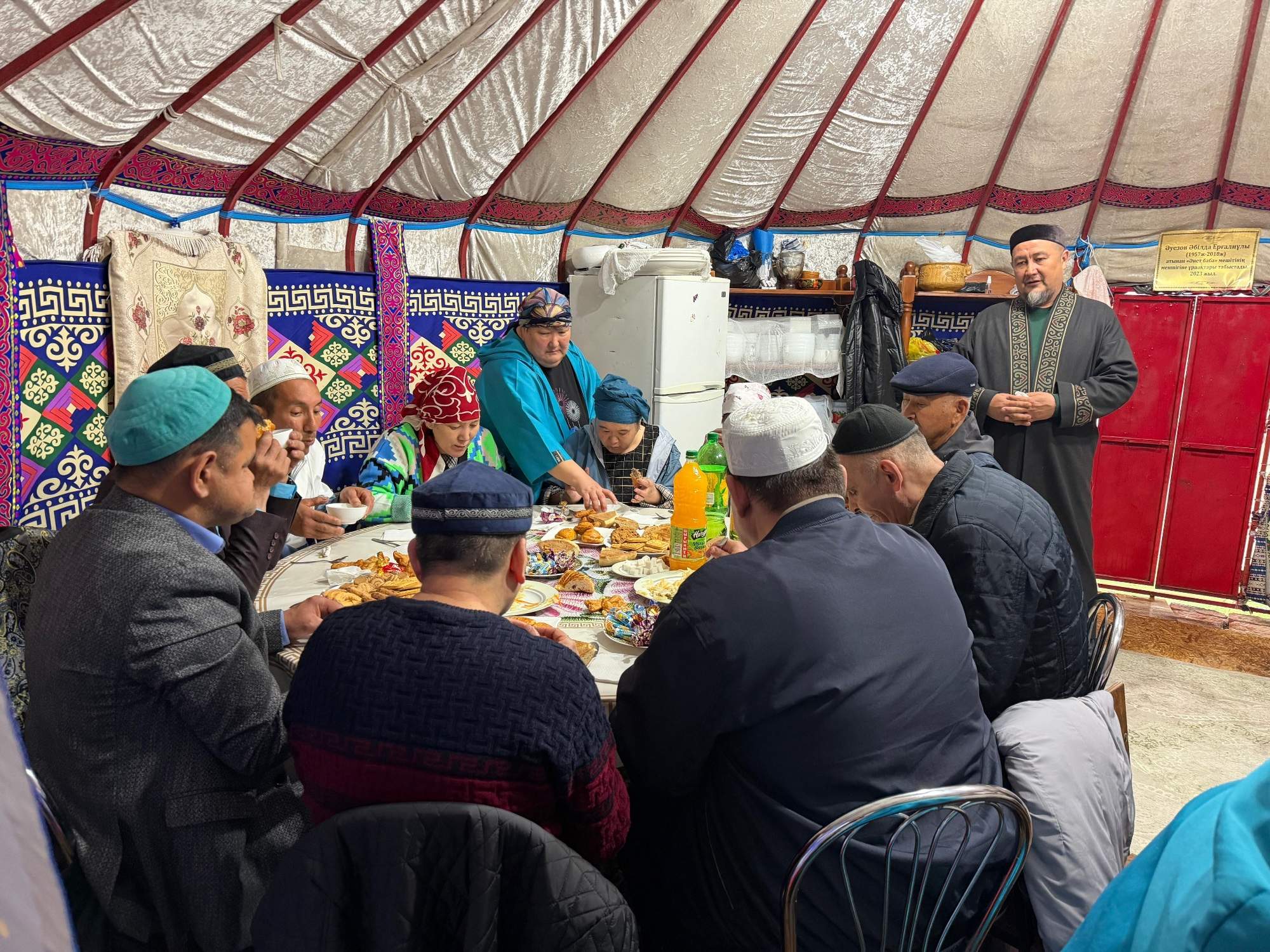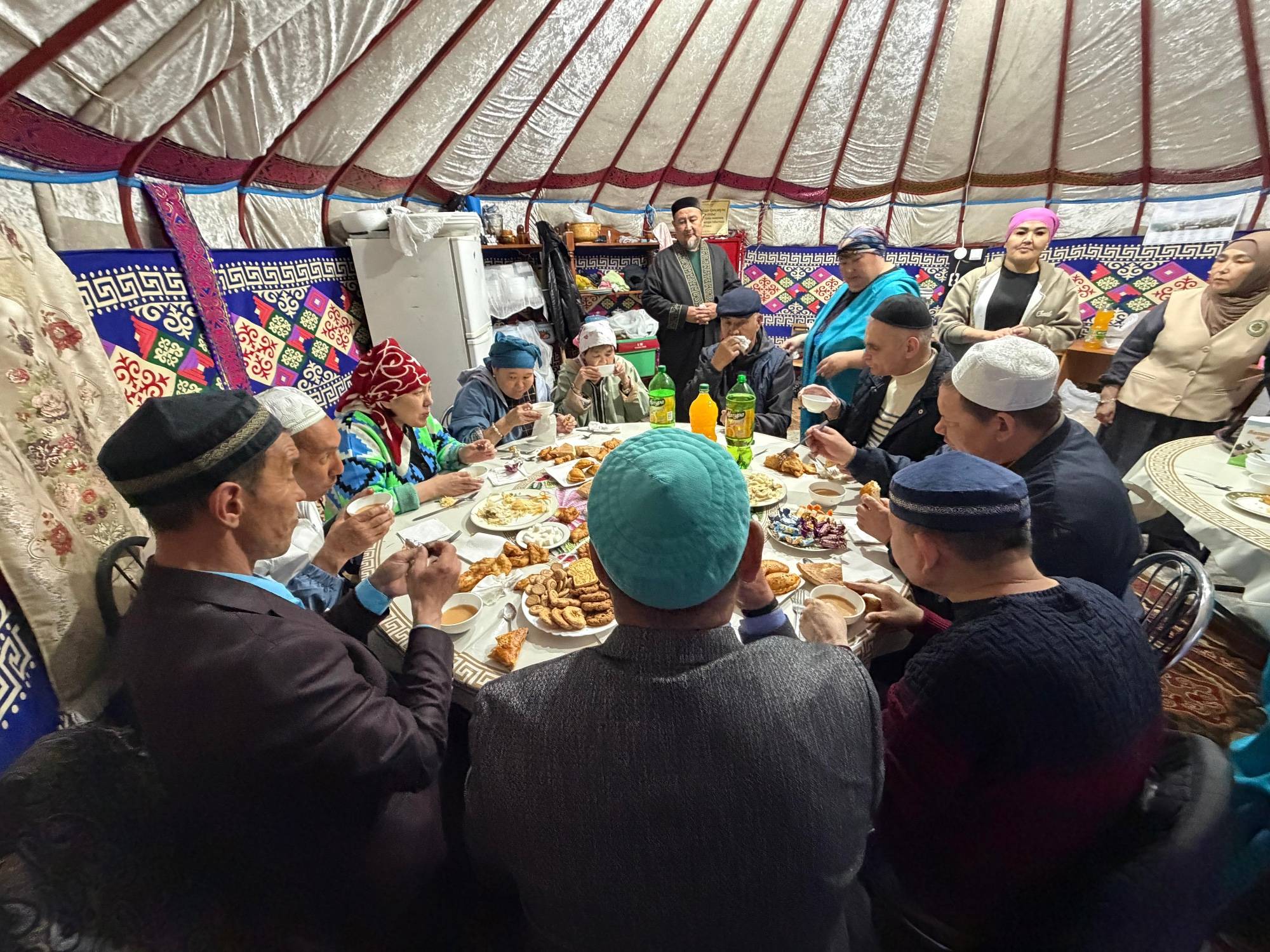 Шара аясында мешіт ауласында тігілген қазақы киіз үйде ақ дастархан жайылып, қарияларға арнайы ас берілді. Ұлттық дәстүрге сай көрсетілген бұл құрмет үлкендердің батасын алуға, олардың көңілін көтеруге бағытталды.
