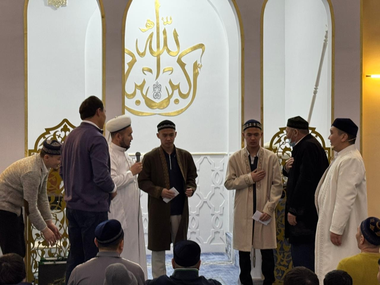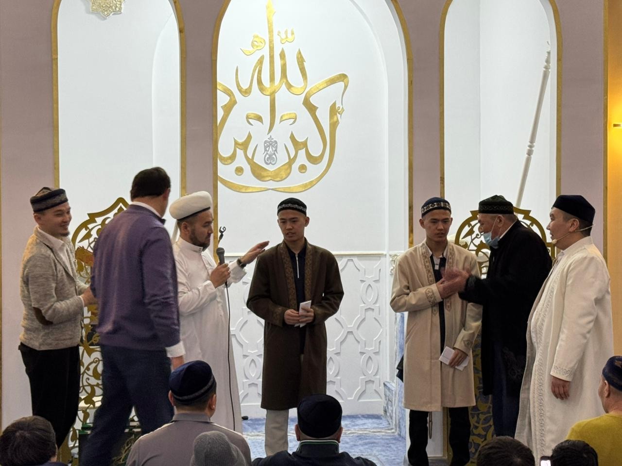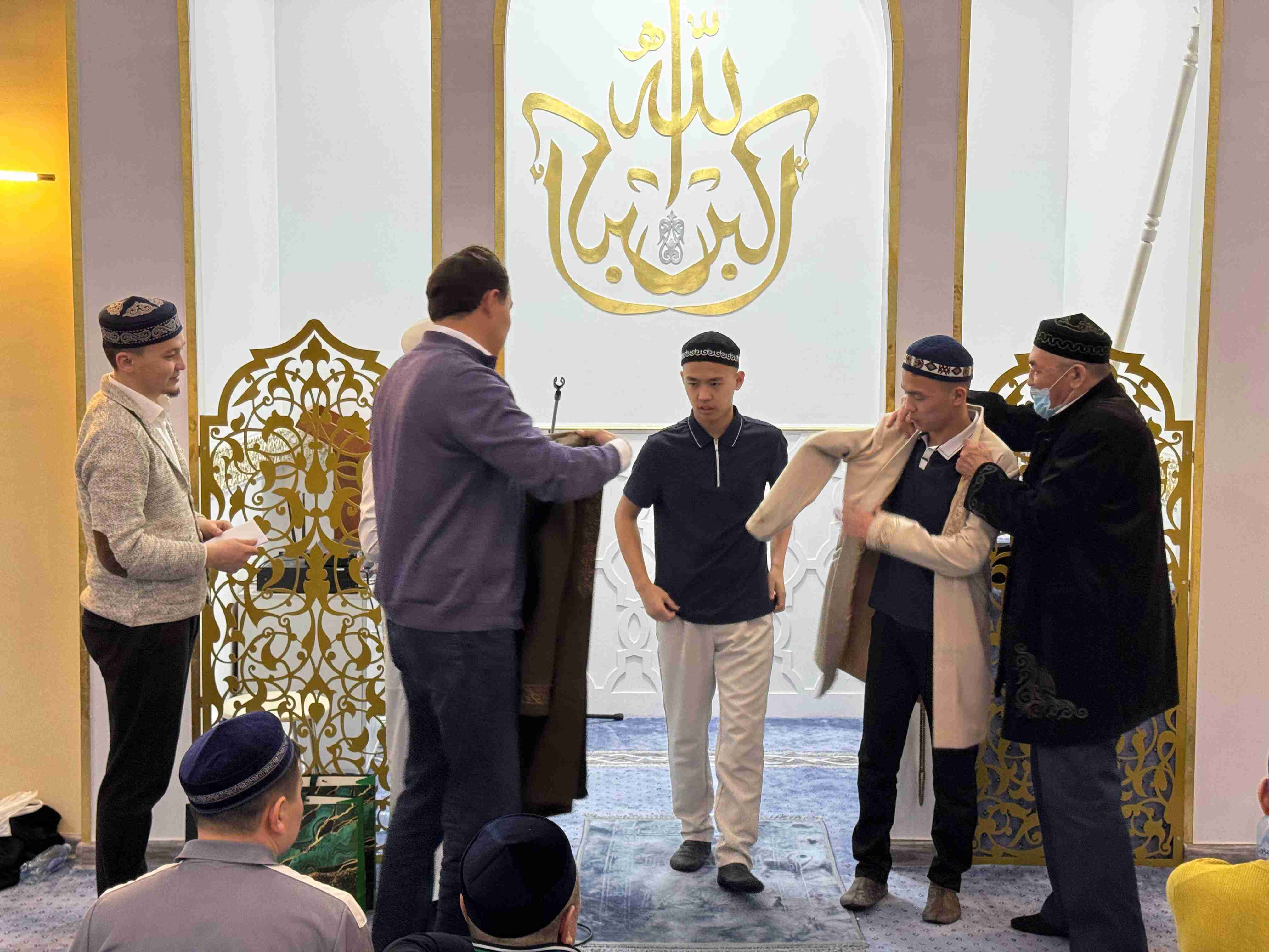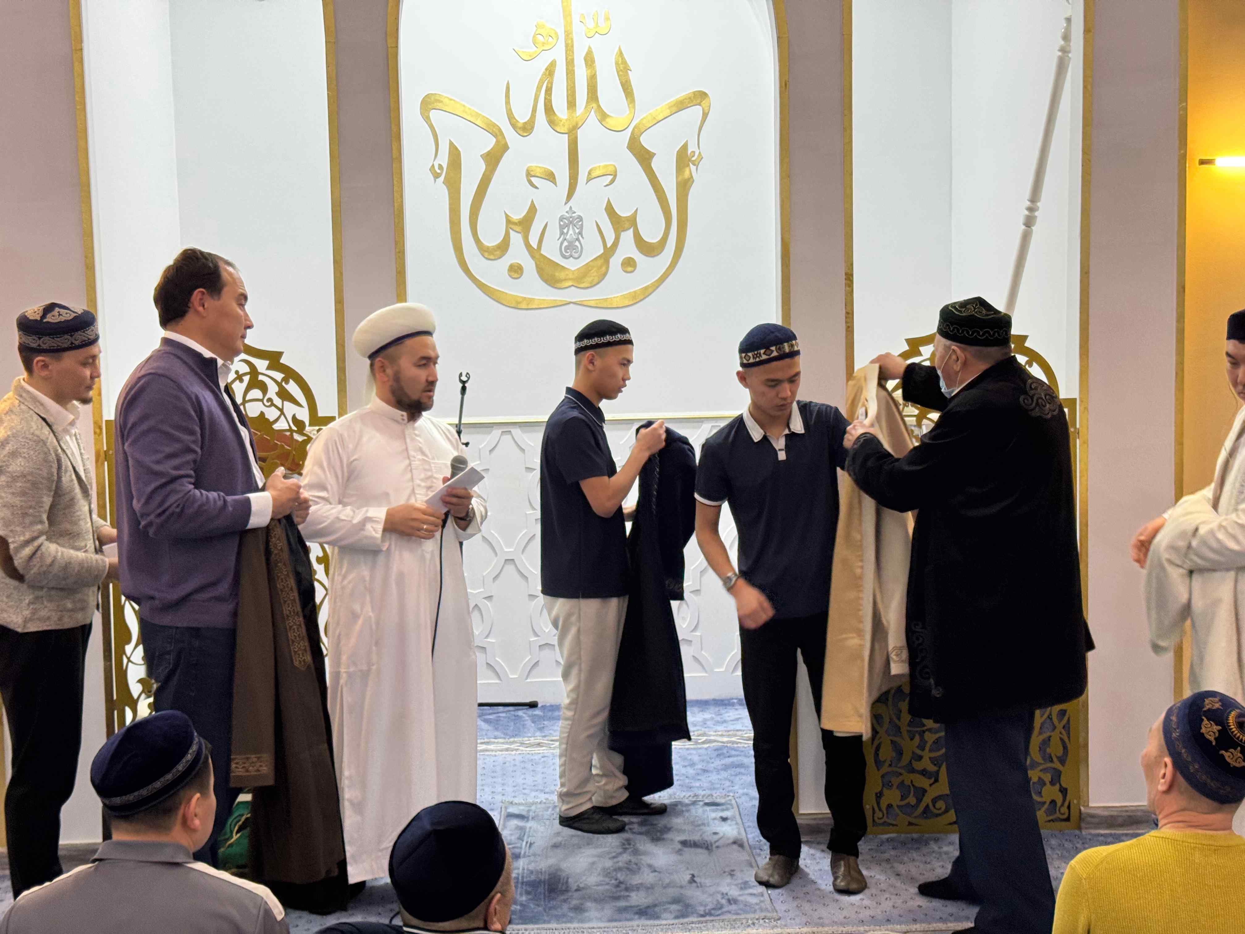 Одан кейін аудан имамы Асхат Қанайұлы бір ай бойы тарауық намазын өткізген қариға құрмет көрсетіп, иығына шапан жапты.