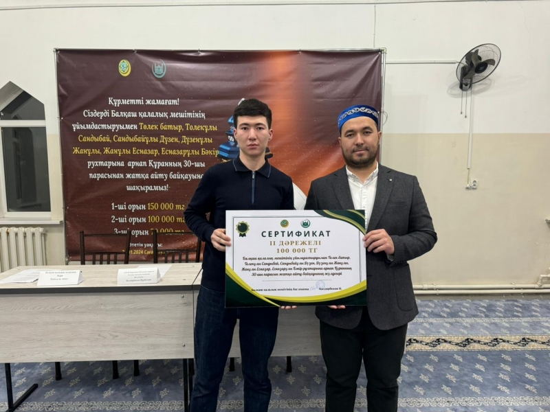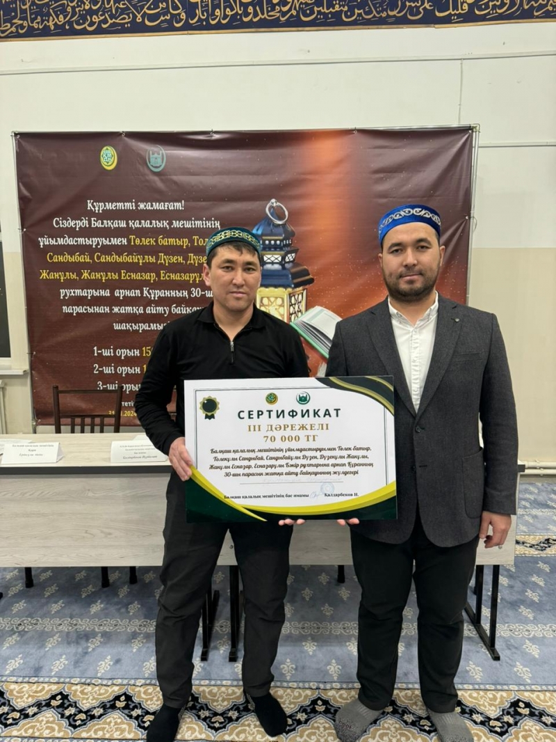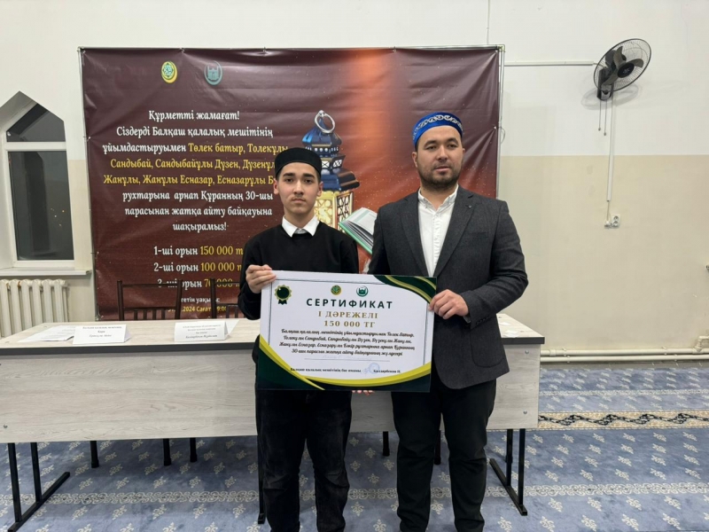 Қарағанды облысына қарасты Балқаш қалалық мешітінің имамы Қалдарбеков Нұрболат Сейлханұлының ұйымдастырумен қасиетті Құранның отызыншы парасын жатқа оқудан жарыс болып өтті.