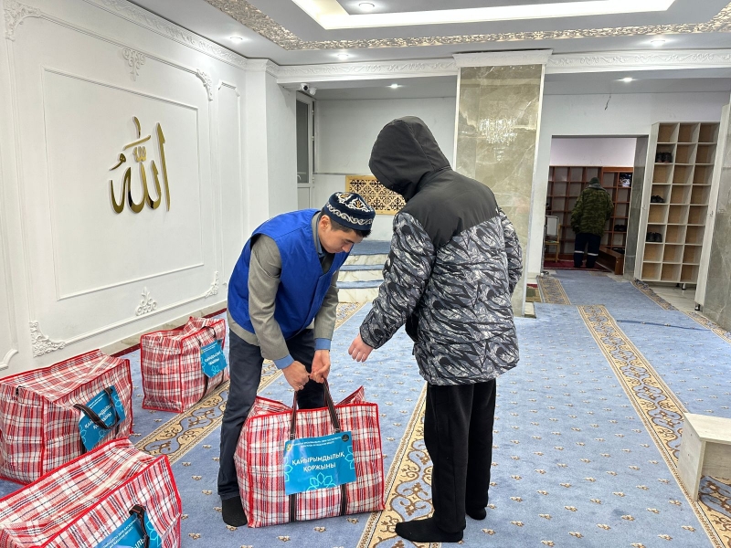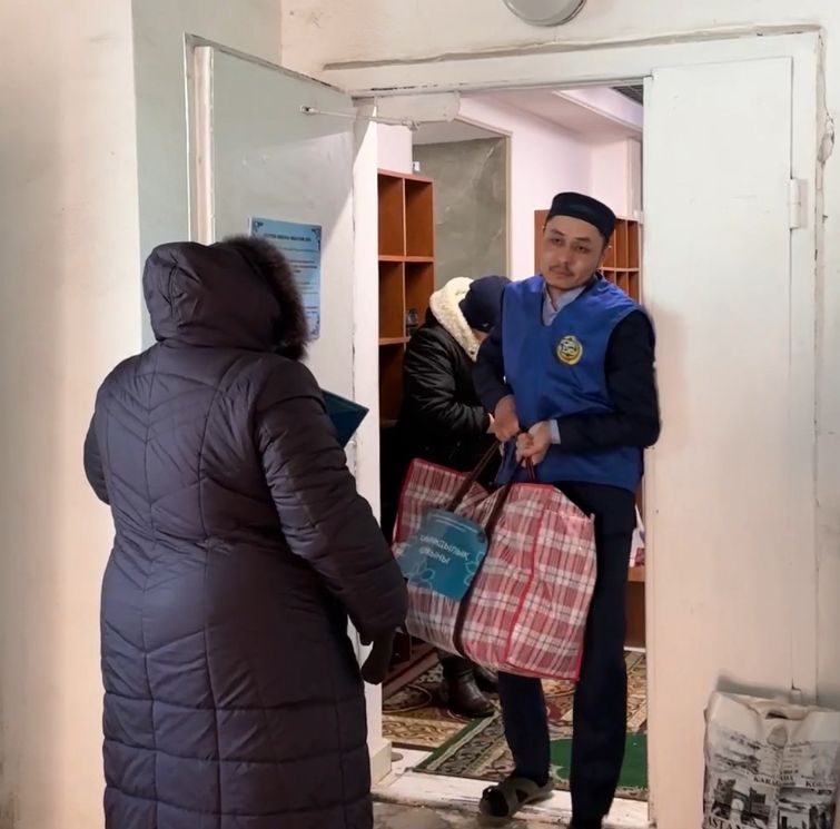 Шара барысында мешіт қызметкері Абдрахманов Дастан көмек алушы мұқтаж жандарға насихат жүргізіп, қайырымдылық қоржындарын үлестірді.