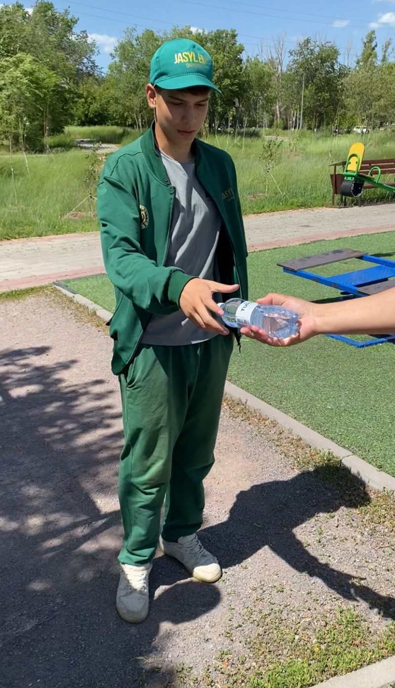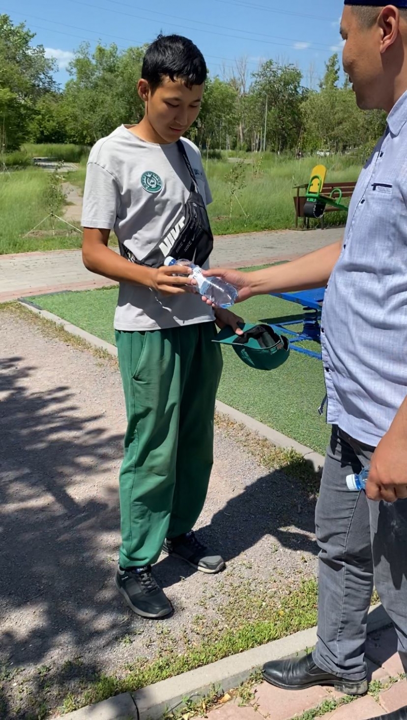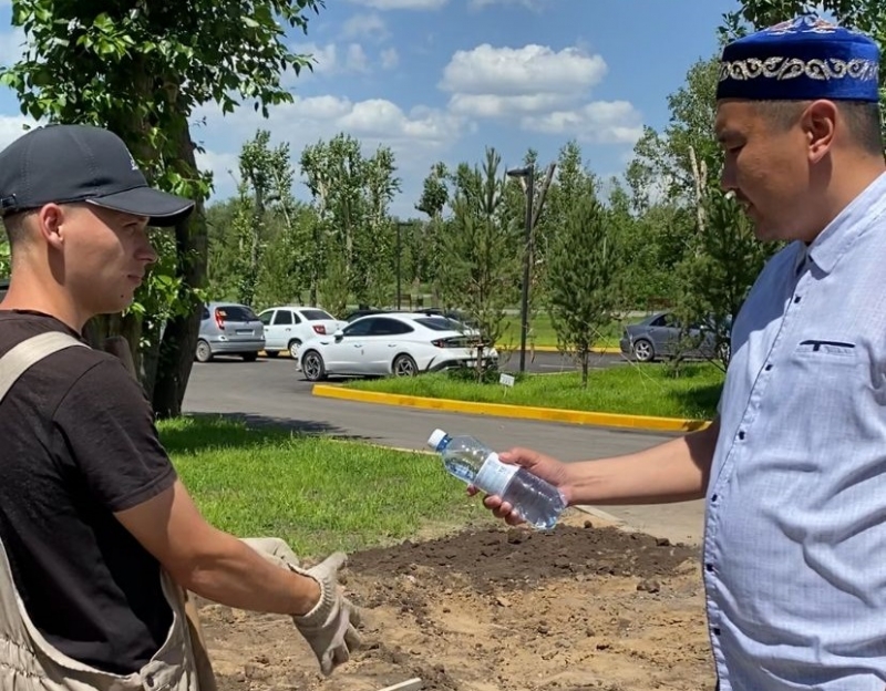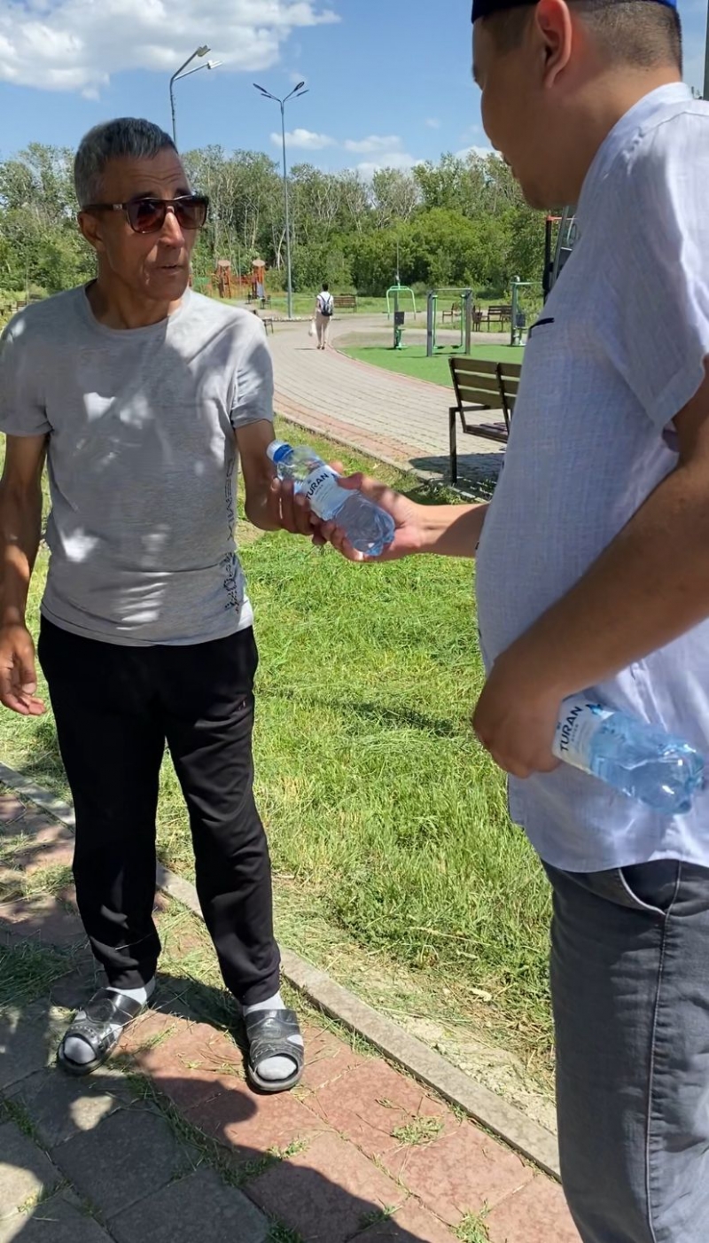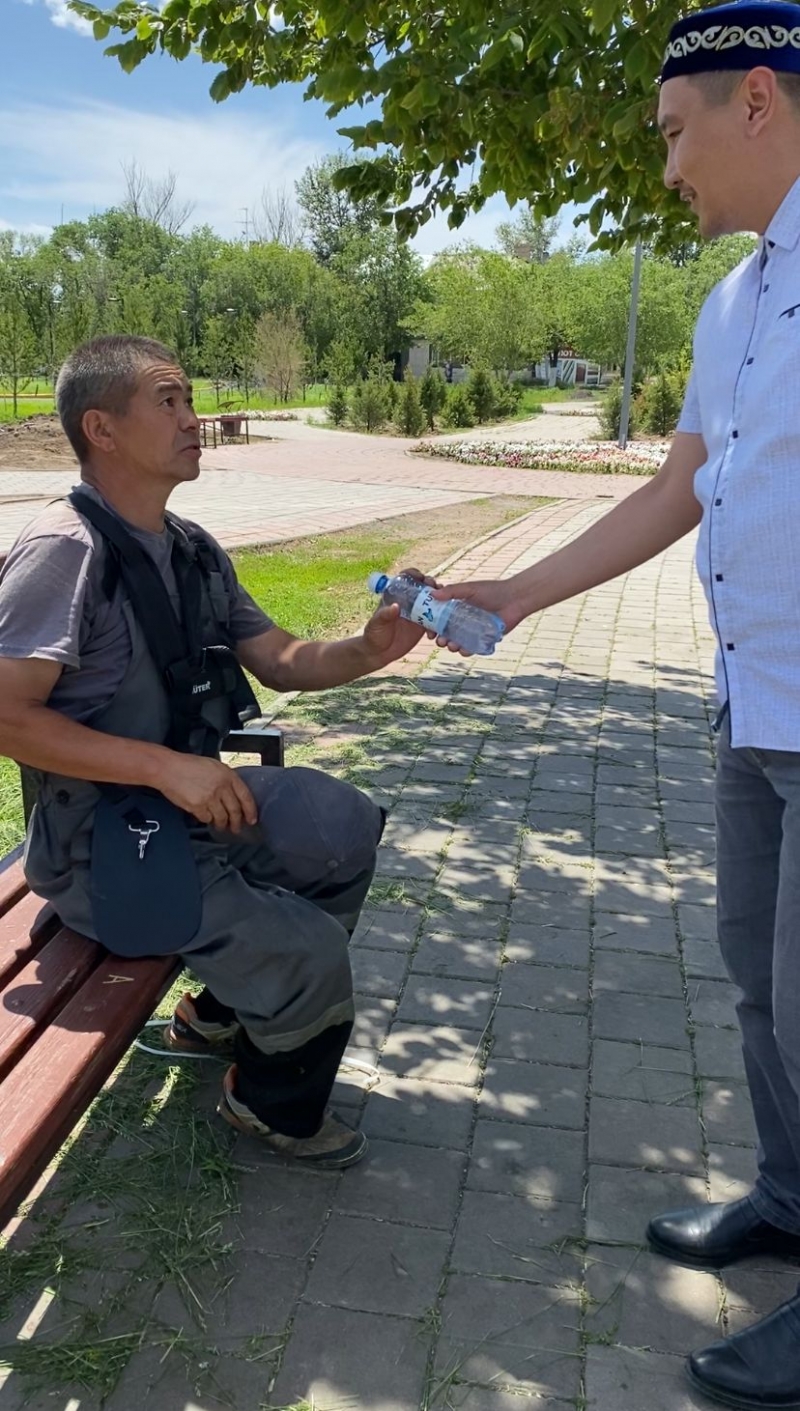 Қарағанды қалалық «Төлеутай ата» мешітінің имамы Рауан Төлеубекұлының ұйымдастыруымен аптап ыстықта көше және саябақ жұмыскерлеріне салқын су таратылады.